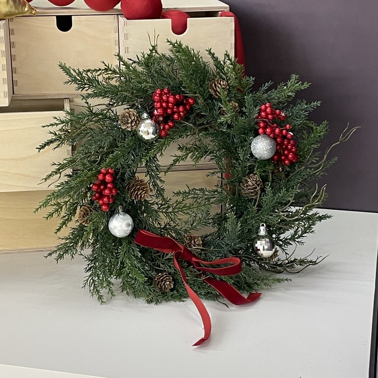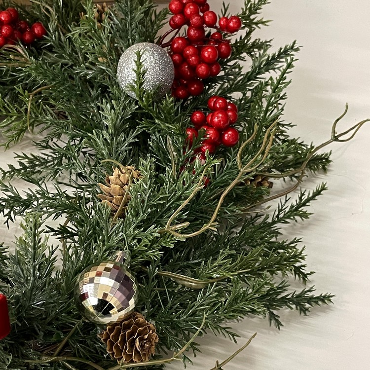 크리스마스의 상징, 붉은 열매와 파인트리 조합에 실버톤의 오너먼트를 달아주었습니다.